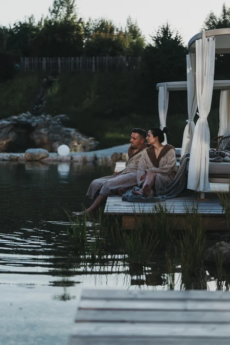 Retreat with a view. And a feeling. It's been here since 2024 - the new haven of peace in the countryside. Only for guests aged 14 and over. Inside it smells of herbs. The panorama sauna offers a view of the garden. Lying softly - in floating loungers or cozy bunks. Outside, the water whispers in the bubble pool. The natural bathing pond glistens silently in the light. Nature everywhere. Space everywhere. For breathing space. For warmth. For you. Feel the Gart'l - and let go.