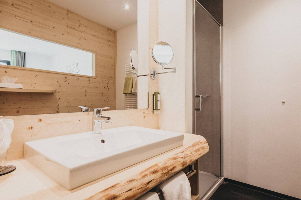 Our "Zirbe Waldesruh" rooms are furnished with modern solid wood furniture. The Swiss stone pine wood has been proven to lower your heart rate and protect against earth radiation. The naturalness of the forest is also reflected in the bathroom and the spruce wood. This room type is available with a balcony on the north side of the main building.Â